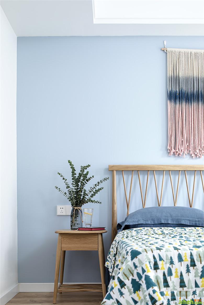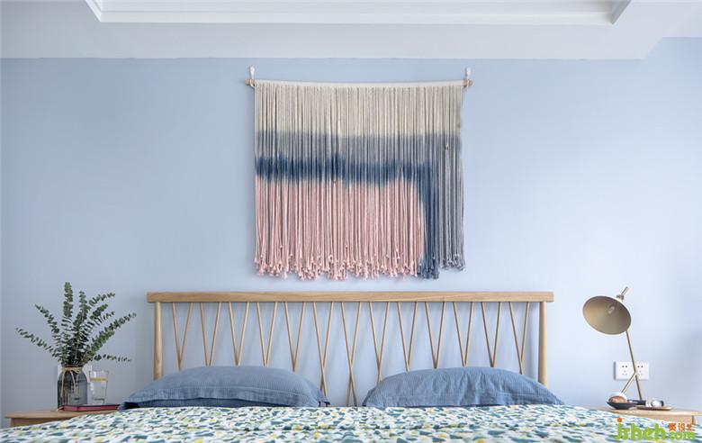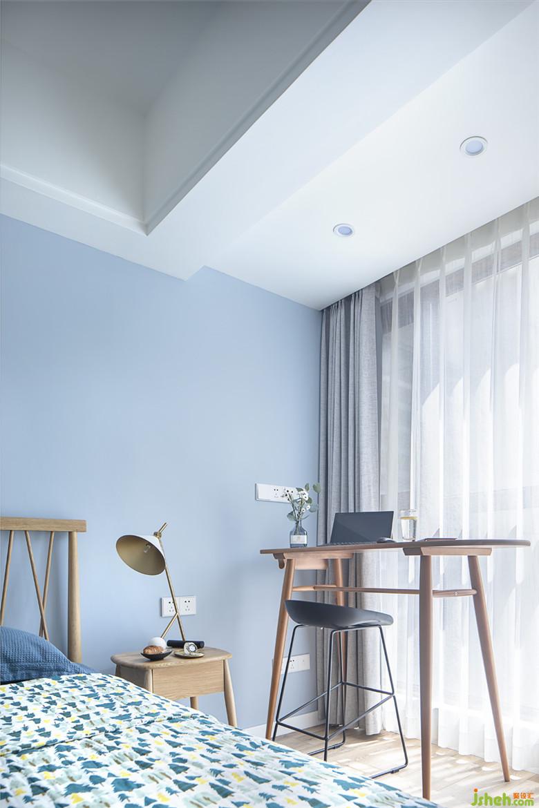 主臥室內(nèi)設(shè)計(jì)師采用開敞式的設(shè)計(jì)方法,將衣帽間、衛(wèi)生間和臥室放在一起,做成一個(gè)套房,并安排了一個(gè)讀書的角落,讓主人擁有一個(gè)獨(dú)立的私密空間。沒有復(fù)雜的硬裝造型,用淺藍(lán)色的背景墻和北歐風(fēng)的木框床,營(yíng)造出安靜而雅致的空間氛圍。