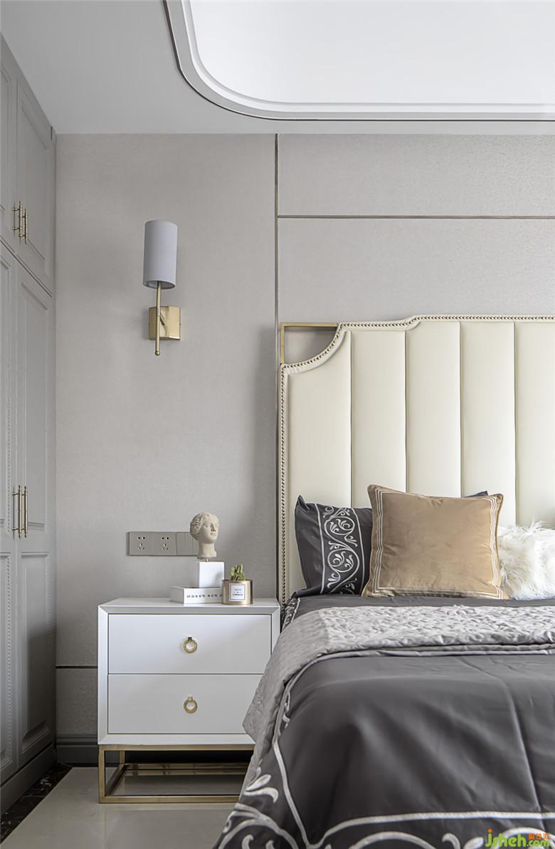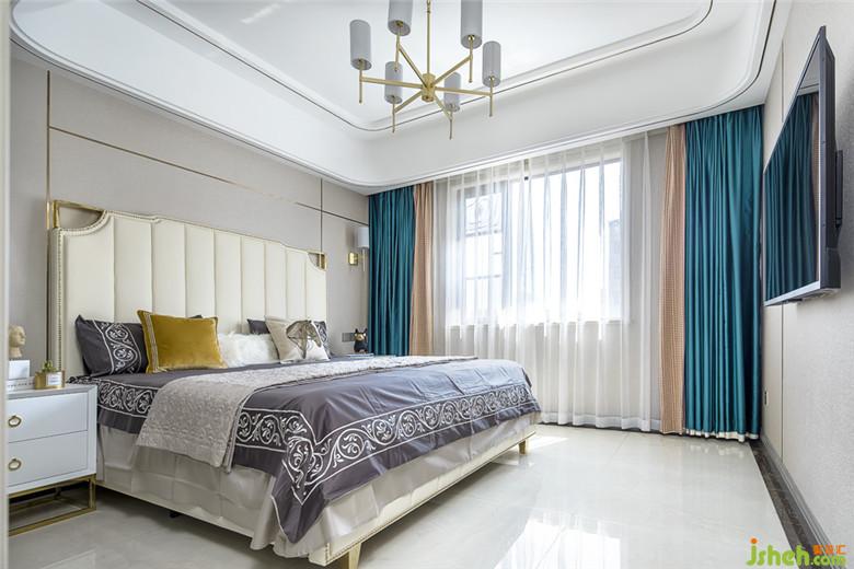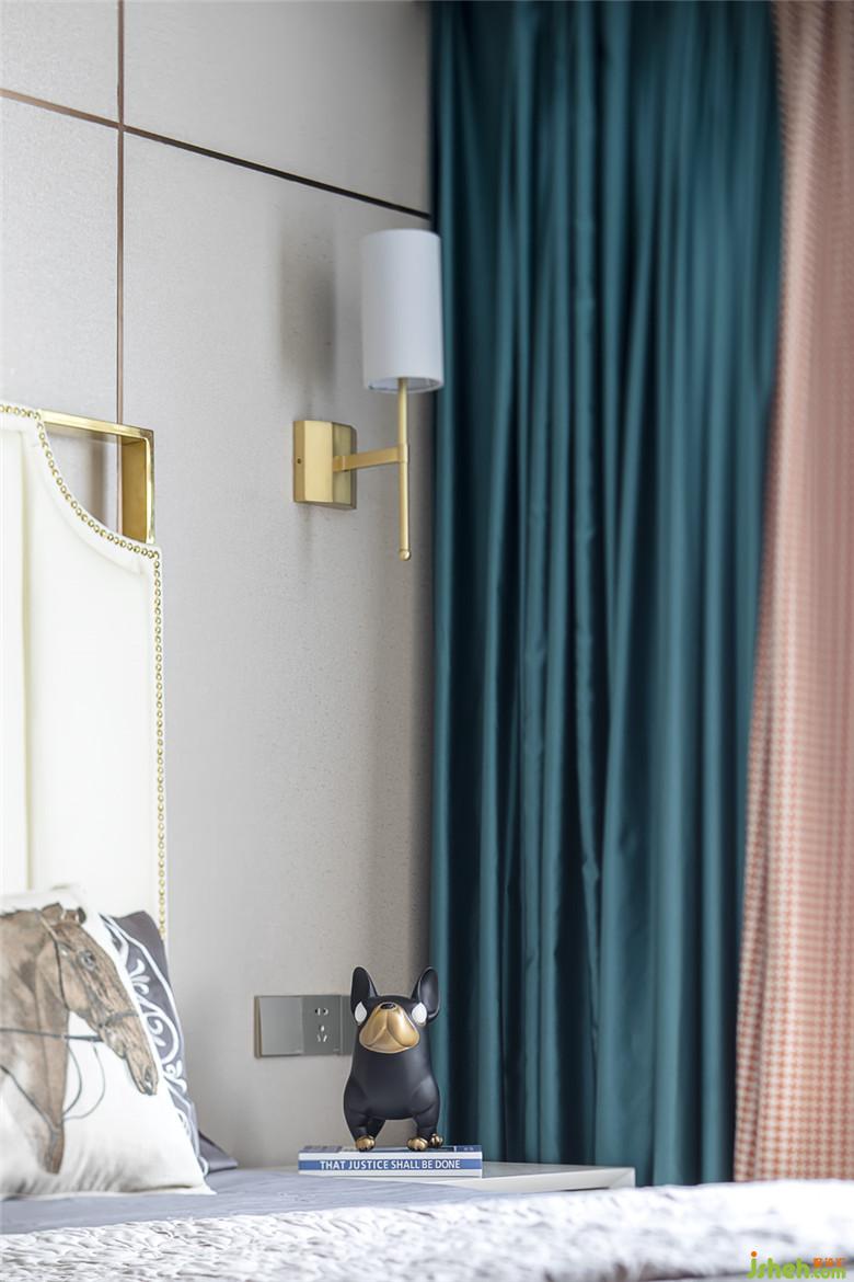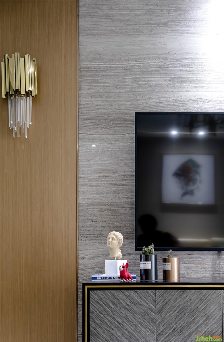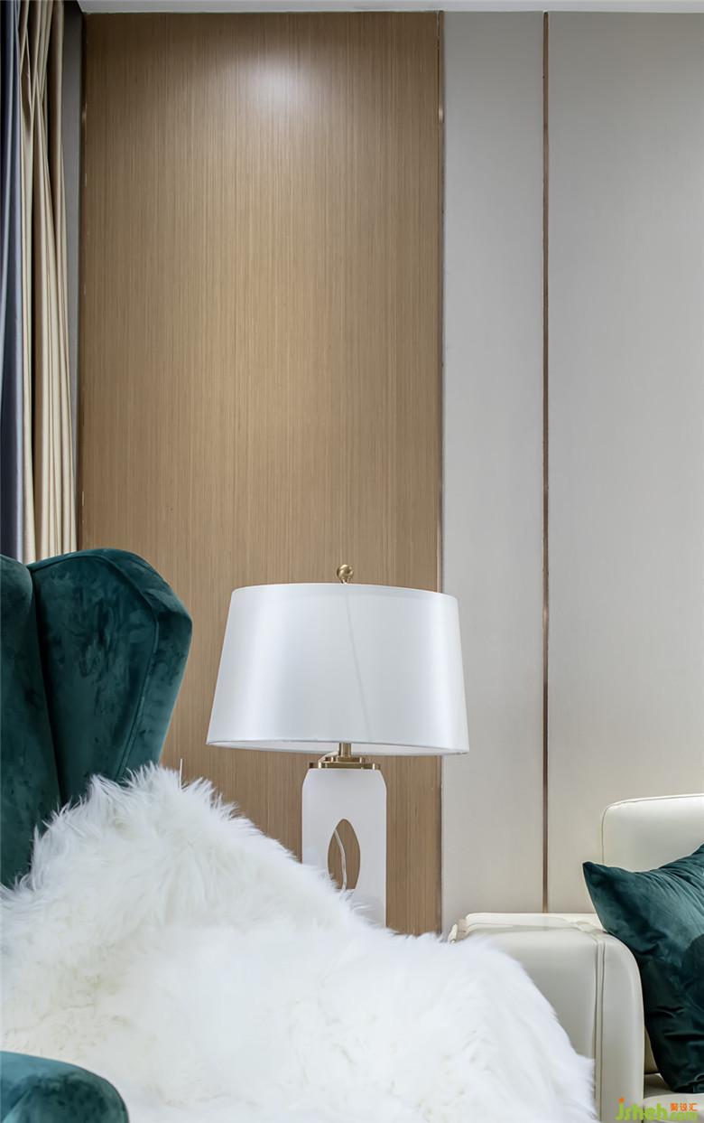 墻面不完全對(duì)稱,室內(nèi)設(shè)計(jì)師把墻面劃分成三個(gè)區(qū)域,使客廳電視背景墻和沙發(fā)背景墻對(duì)稱。精致的弧形吊頂,不同的材質(zhì)碰撞的交錯(cuò),墨綠色的墻紙搭配淺色的木飾面,碰撞出時(shí)尚摩登的視覺(jué)效果。