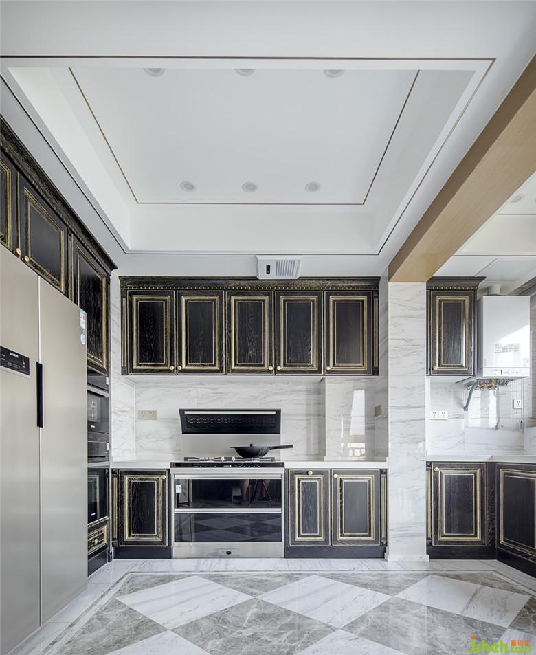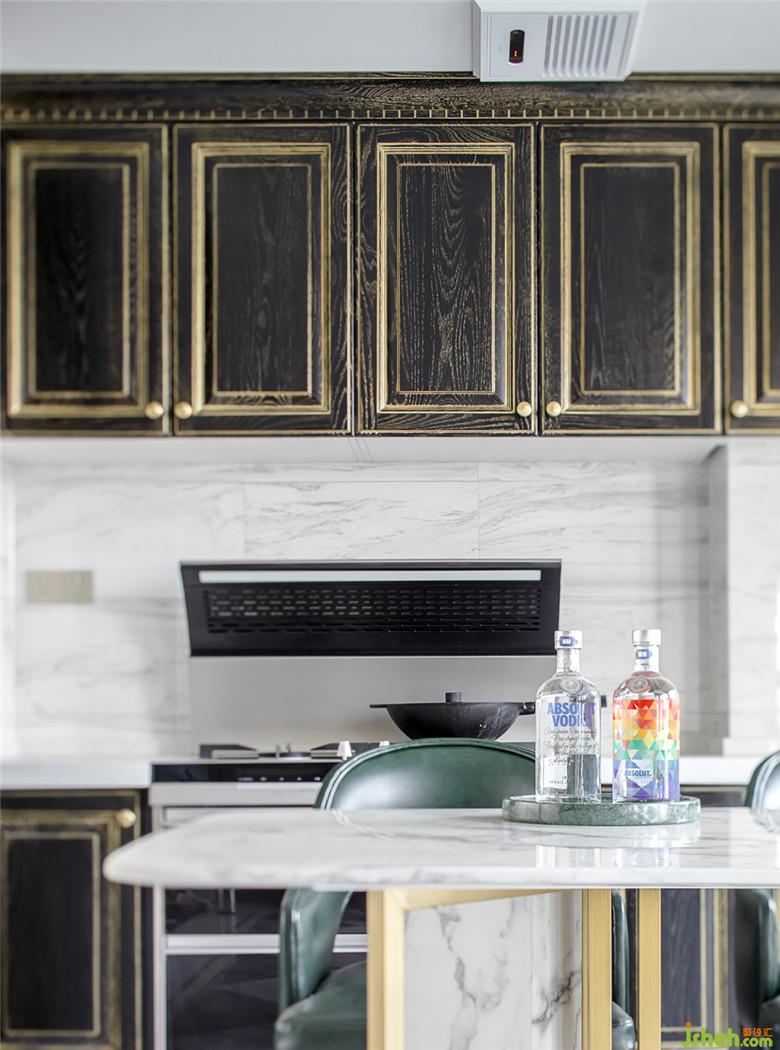 室內(nèi)設(shè)計(jì)師把原有的餐廳,廚房,休閑陽(yáng)臺(tái)全部拆除掉打通,一進(jìn)玄關(guān)第一眼就能看到湖景。將餐廳,休閑陽(yáng)臺(tái)合并為一個(gè)大的廚房,開(kāi)放式的設(shè)計(jì)將自然光最大限度的引入廚房,仿石材瓷磚搭配黑色做舊描金櫥柜撞色,將整潔的廚房映襯的更加明亮。