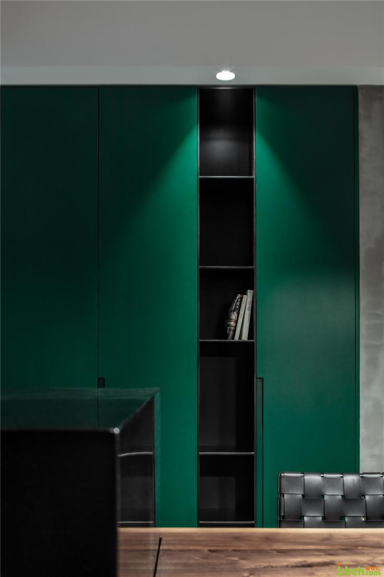 孔雀綠的柜體大大增加了收納空間,也為黑白灰基調(diào)的空間增添了勃勃生氣。