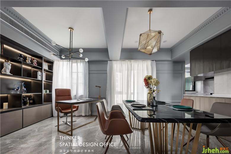 室內設計師吊頂?shù)脑O計,減弱了梁體帶來的突兀感,也與客廳呼應,和諧統(tǒng)一。定制書桌與陽臺門也連成一體,選擇同樣的金屬材質,甚至陽臺門也定制了2cm的不銹鋼門框,只為保持風格的一致性。