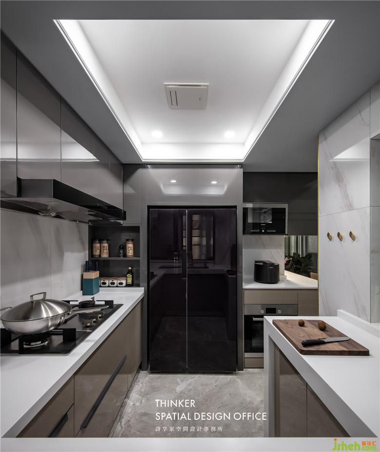 與普通廚房的平頂不同,這個廚房的吊頂延續(xù)了餐廳的造型,搭配點光源,非常有設計感。櫥柜選擇了烤漆門,現(xiàn)代感十足,分隔收納設計也充滿了小心機,各種電器設備齊全,就算一個人住,也要好好吃飯。