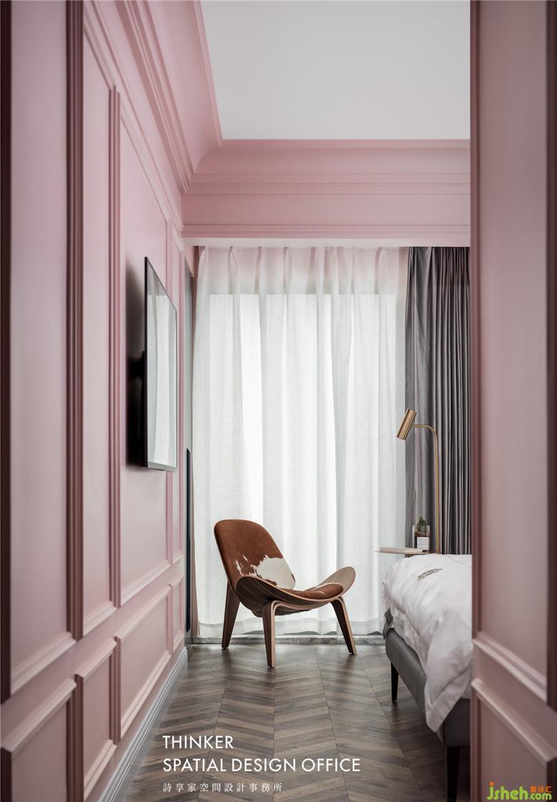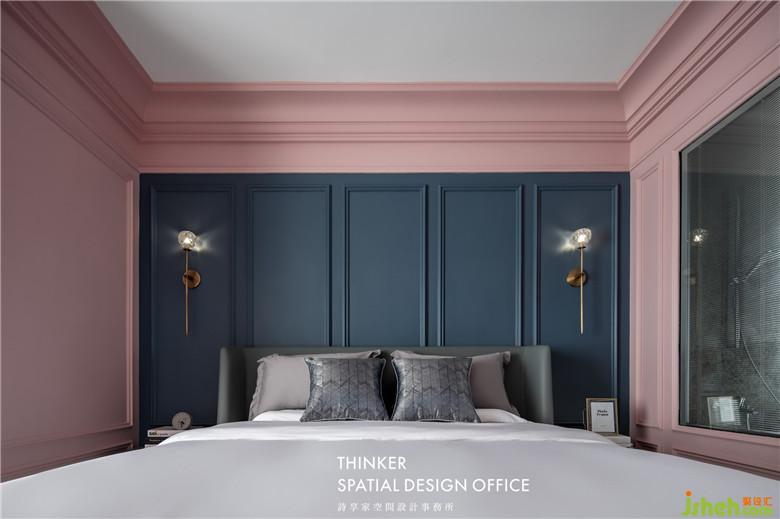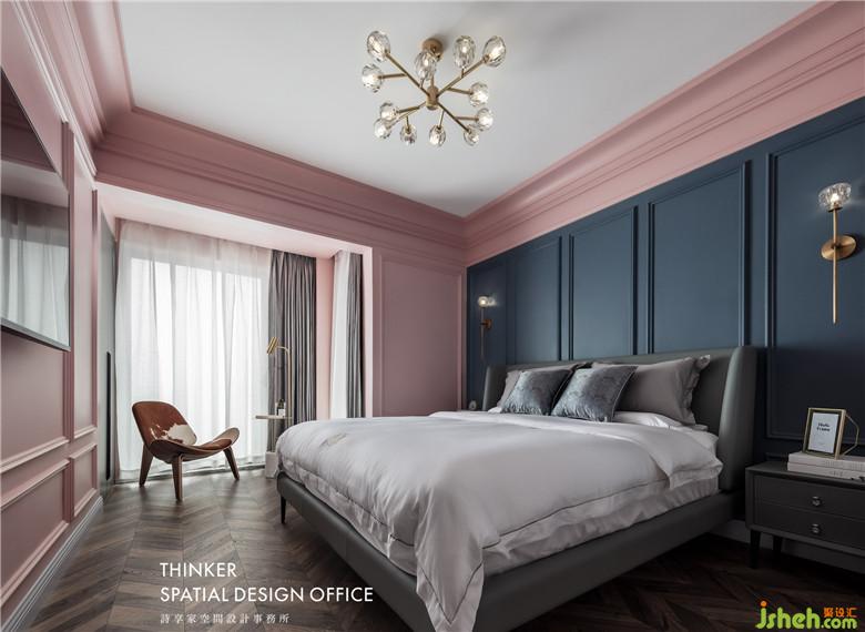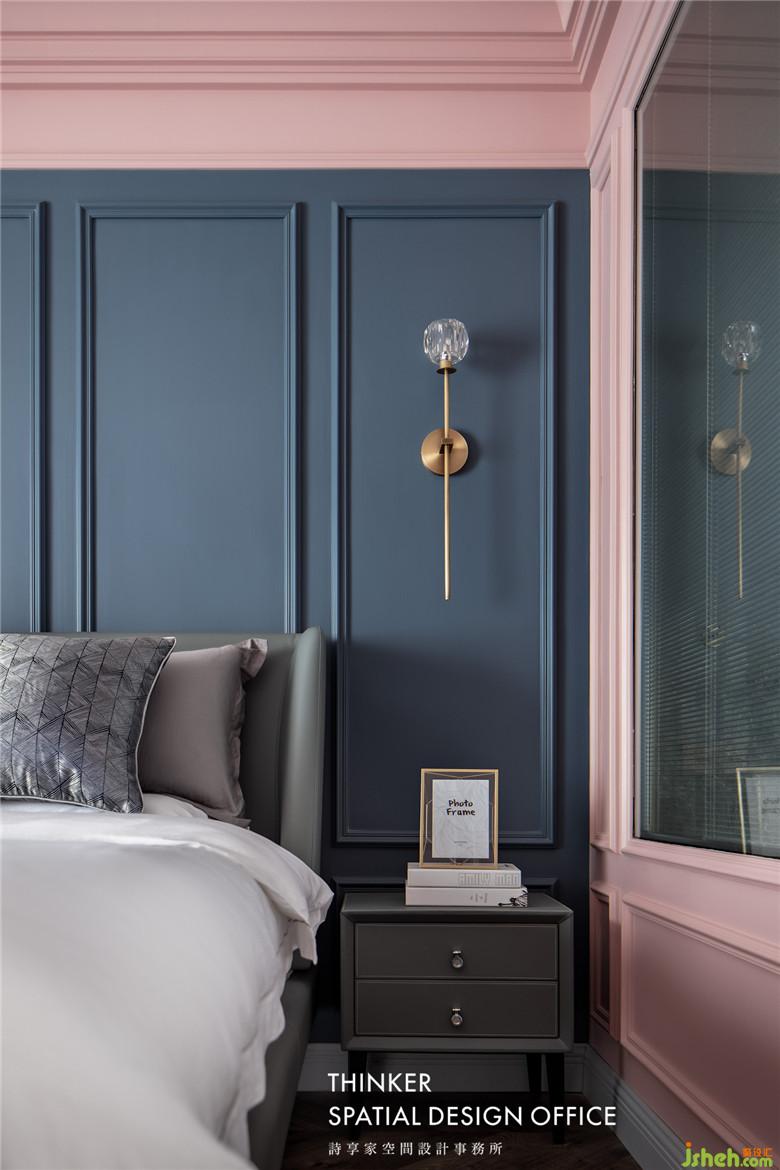 室內設計師以灰粉色墻面包裹臥室,柔軟而溫和,床頭內斂的灰藍色,又為空間注入沉穩(wěn)安靜的氣息,魚骨拼地板更帶來法式的優(yōu)雅。好好睡覺,很重要。
