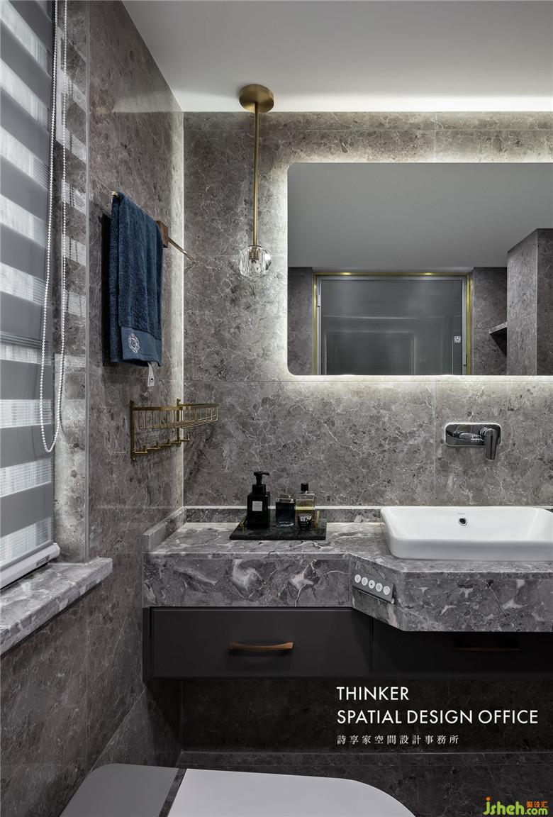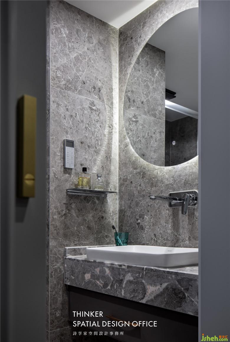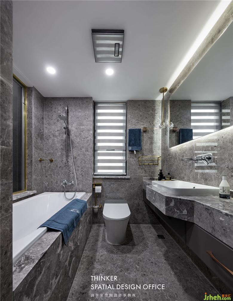 主衛(wèi)整體室內(nèi)設(shè)計(jì)師選擇了水磨石質(zhì)感的瓷磚,硬朗大氣,還非常耐臟,梳妝鏡選擇了燈帶的款式,讓面部光照更均勻,浴缸更是提升幸福感的必備品。