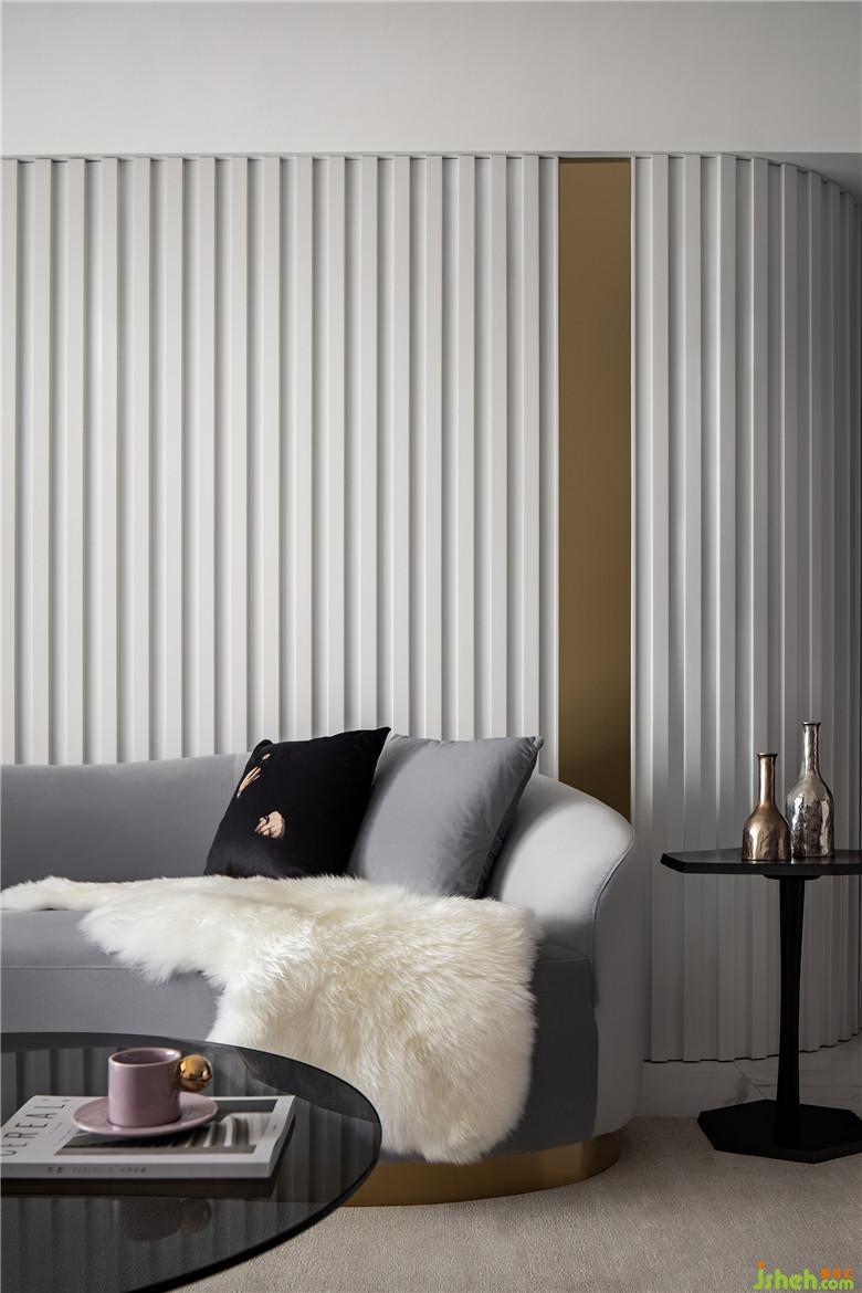 · 白色木格柵打造的沙發(fā)背景,巧妙地規(guī)避了臥室轉(zhuǎn)角的僵硬感,還讓空間顯得更為流暢。嵌入金色線條,精準(zhǔn)把控比例,成為點(diǎn)睛之筆。裝修設(shè)計(jì)