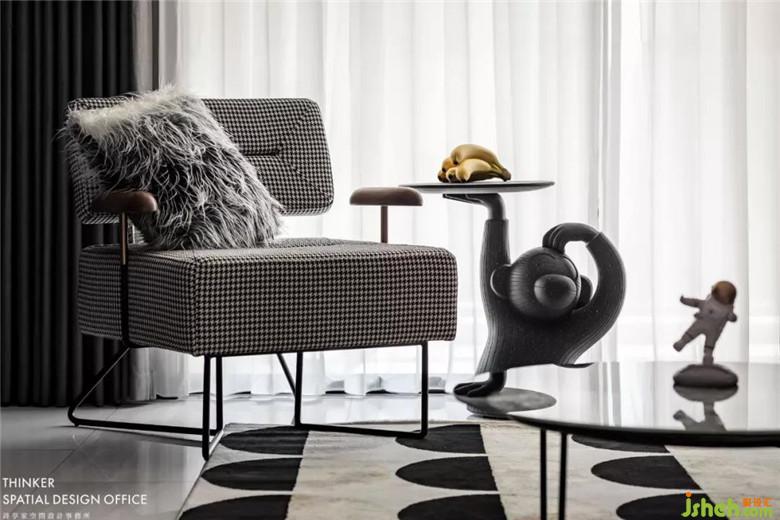 千鳥格的方糖沙發(fā),給人一種可鹽可甜的美感,北歐猴子托盤茶幾,讓藝術(shù)在空間游走,兩者形成摩登而時(shí)尚的畫面。