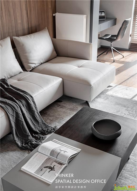 · 矮腳拼色茶幾拉低視線,為空間“減負(fù)”,高級(jí)灰和胡桃木的拼色與沙發(fā)顏色呼應(yīng)又不顯單調(diào)。