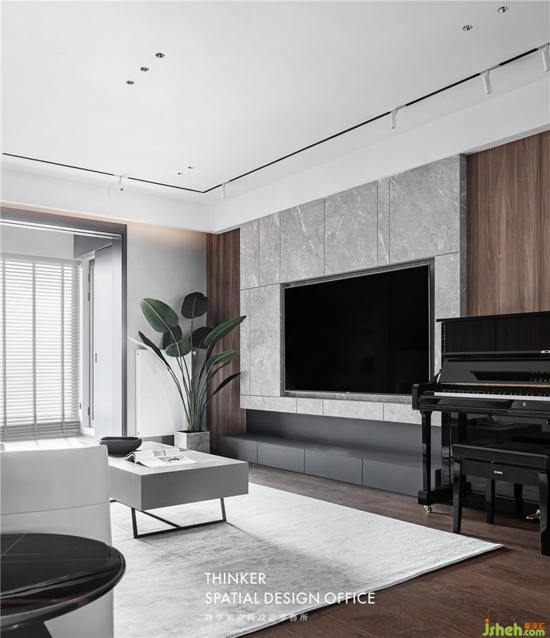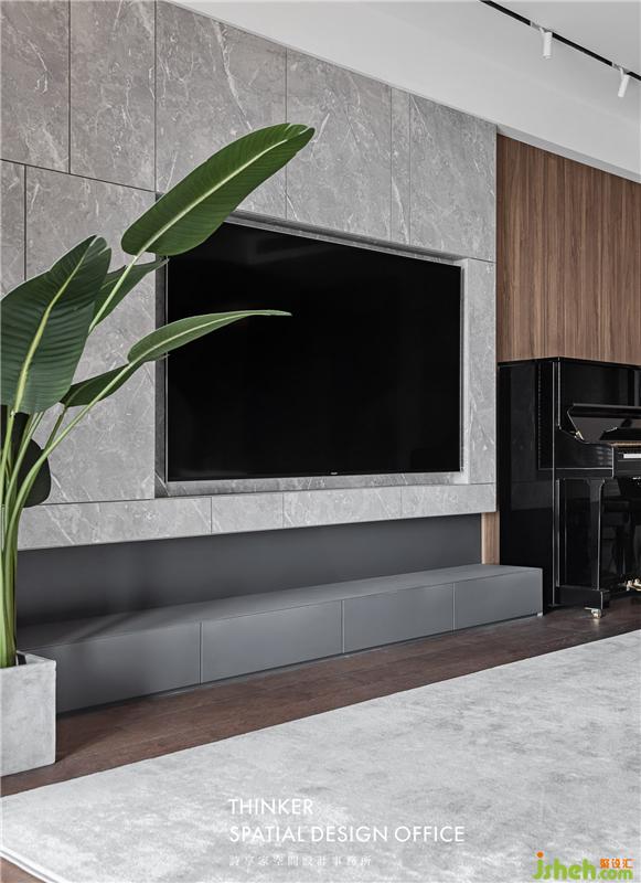 · 電視背景墻采用石紋板拼接而成,電視內(nèi)嵌,視覺上整潔不突兀,下方的置物臺(tái)沿用高級(jí)灰的選色,下方抽屜也有收納功能。