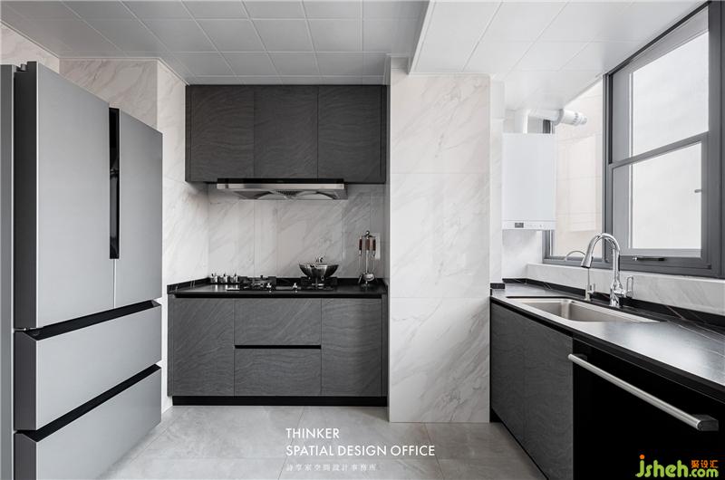 · 廚房以實(shí)用好打理為主要需求,顏色上沿用了黑白灰的配色,根據(jù)梁體布置的U型廚房,提高空間利用率,優(yōu)化烹飪動(dòng)線;