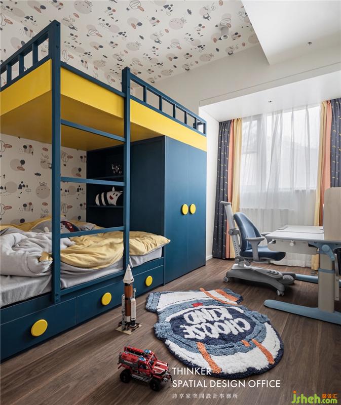 · 兒童房是承載孩子最初夢(mèng)想的地方,黃色和藍(lán)色的色彩搭配讓這個(gè)空間充滿趣味。壁紙是孩子和設(shè)計(jì)師一同挑選的,白底不會(huì)讓空間壓抑,上面的卡通形象顯示著孩子內(nèi)心的天真童趣;