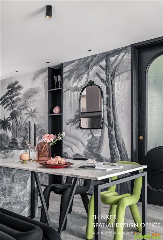· 從客廳延伸至餐廳的植物系壁紙,是整個空間的設(shè)計亮點。生活在鋼筋水泥的都市,越發(fā)向往美好的大自然,加入植物元素,讓家的氣質(zhì)加分,同時讓空間的自然氣息更加濃郁,生機勃勃。