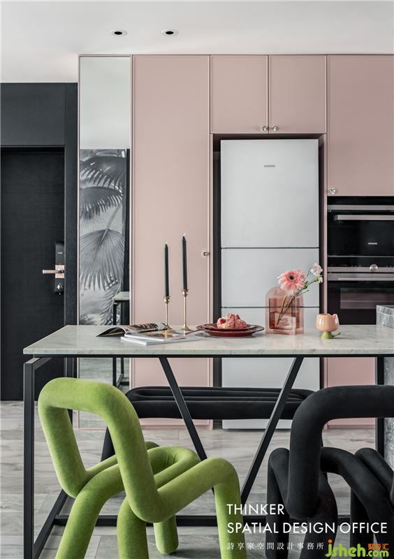 · 黑白灰為基底,以清新自然的綠色為點綴,揉合溫煦的粉、質(zhì)感軟裝等,勾勒現(xiàn)代時尚場景。每個角落都能感受到女主人溫暖而自信的情感。