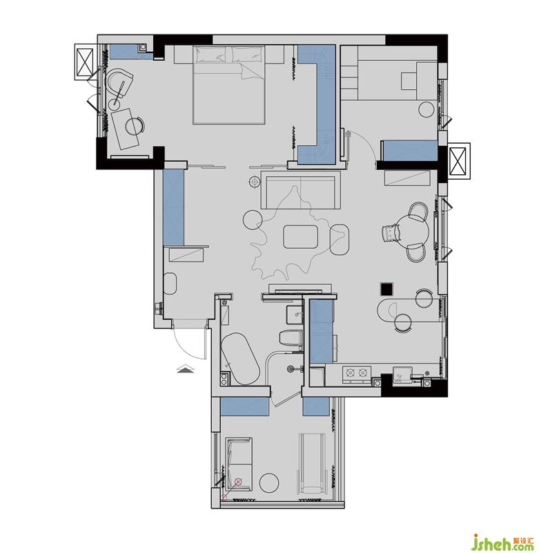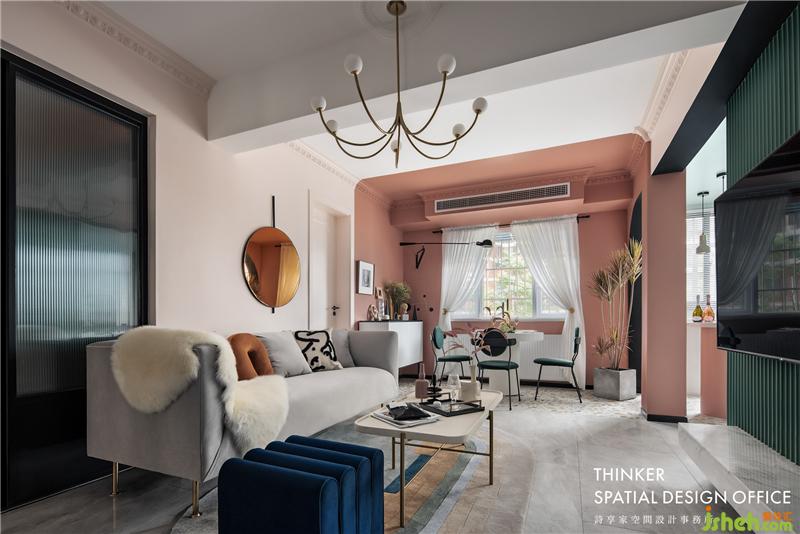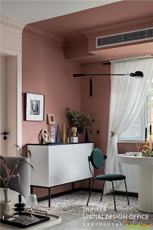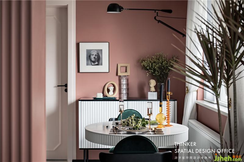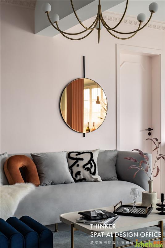 · 經(jīng)典的灰粉配色讓空間顯得年輕有活力,而材質(zhì)的質(zhì)感則很好地烘托出色彩的表現(xiàn)力,再點綴少量的寶藍和黑色,更顯時尚。