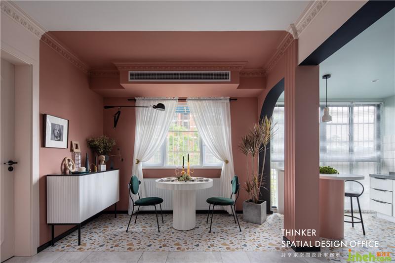 · 以大面積色塊進行功能區(qū)的分隔,相比物理隔斷更通透開闊;同時色調(diào)不同的粉色系形成視覺上的層次感。