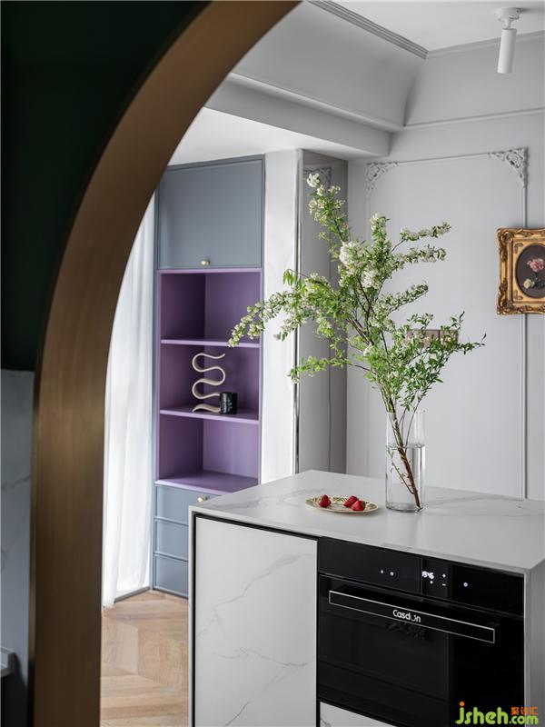 一側(cè)餐邊柜選用香芋紫搭配高級灰,加上轉(zhuǎn)角的不銹鋼反光板,甜而不膩。