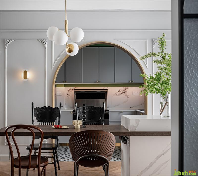 客餐廳開敞無阻,加之打通陽臺的設(shè)計手法,兩側(cè)形成空氣對流。餐桌和島臺一體式設(shè)計,搭配透明亞克力桌腿,通透感更強。超1.8m臺面,不管是兩人晚餐,還是大家庭聚會,都綽綽有余。