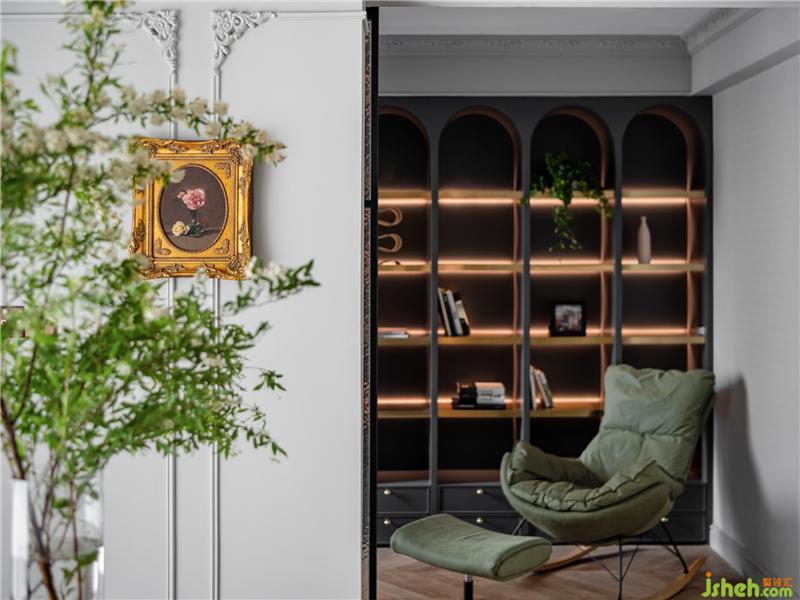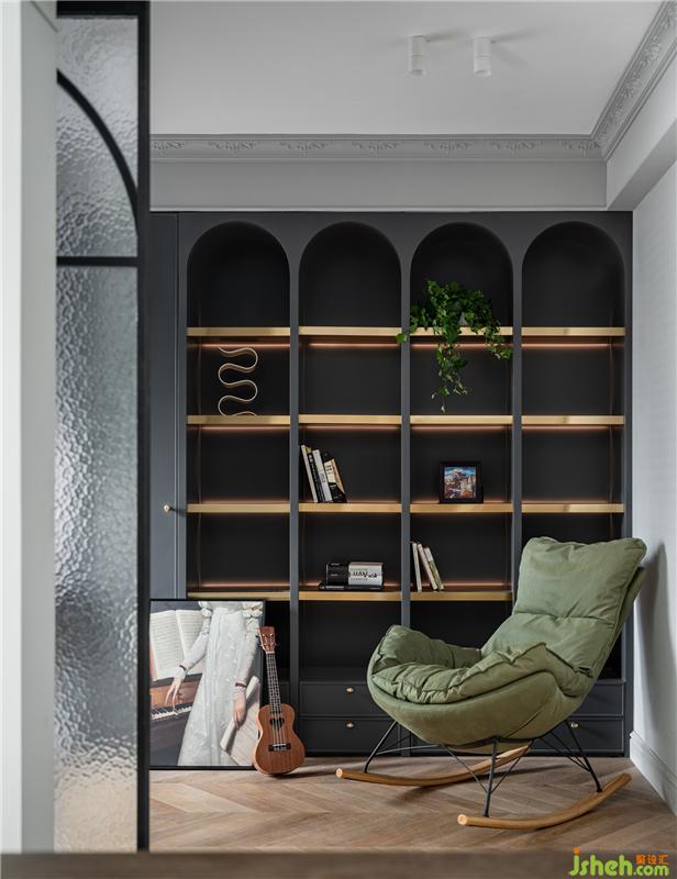 輕盈的上軌道移門+藝術(shù)玻璃,空間可開可合,靈活多變。書房設(shè)置一整面通頂?shù)臅瘢敳抗伴T設(shè)計有歐式建筑感。巧妙選用金屬層板做開放格,搭載上燈光系統(tǒng),金屬自有光澤在暖光烘托下更高級精致!
