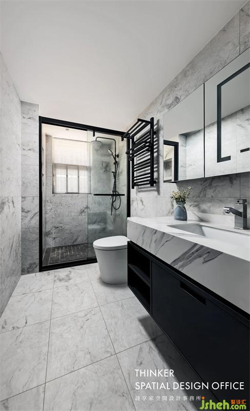 家居設(shè)計(jì)在雅白墻面磚的空間基礎(chǔ)下,通過加入黑色的淋浴房、五金掛件、洗手盆柜等組合,營造出一個時尚高檔的黑白配空間感。