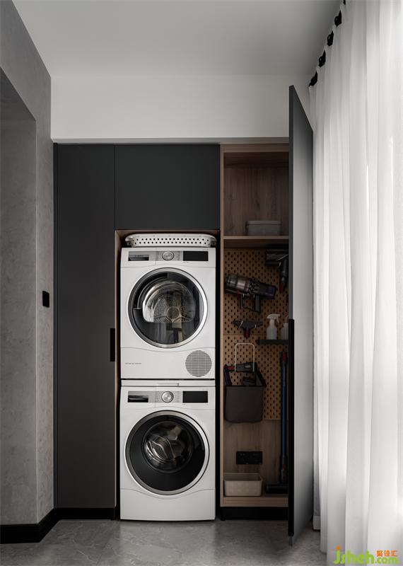 右側柜內的洞洞板上,吸塵器、小工具、清潔噴壺…分門別類收納,使用時一目了然。柜子內預留了插座,吸塵器、除螨儀、洗地機等工具可以輕松充電。