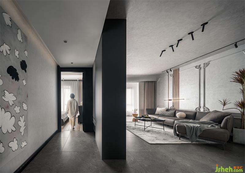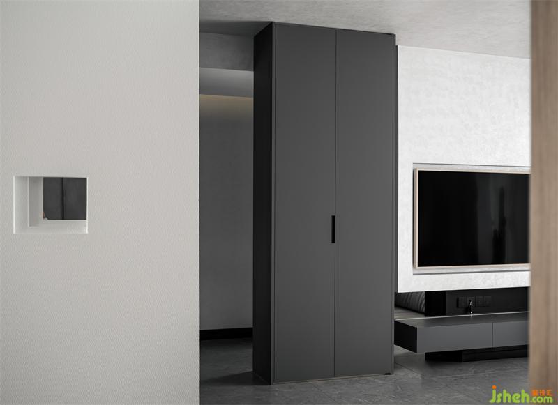 家居設計去掉傳統(tǒng)室內門,30cm的窄柜+120cm的寬柜,既可以收納鞋子,又形成兩個空間的劃分。錯落有致的縫隙,回家第一眼就感受到開闊。
