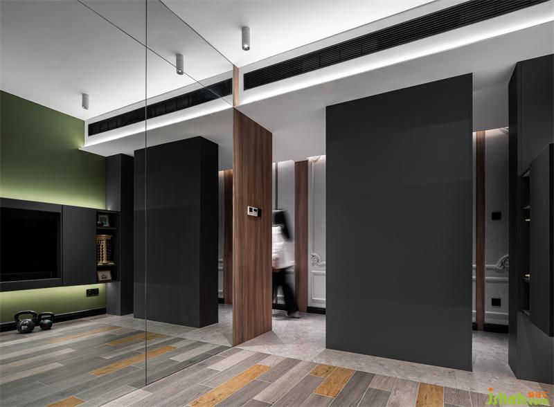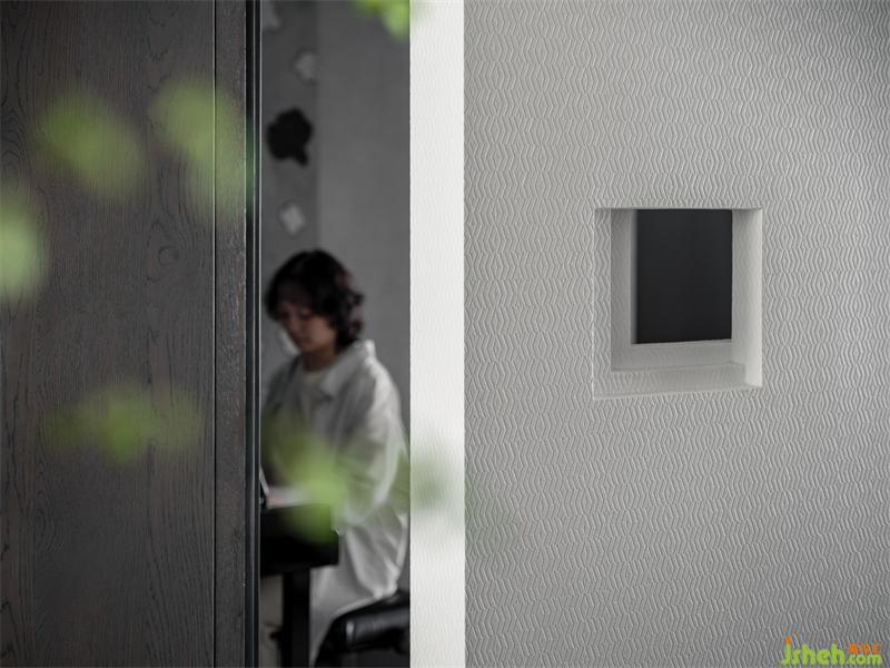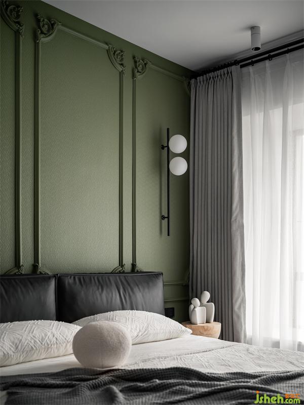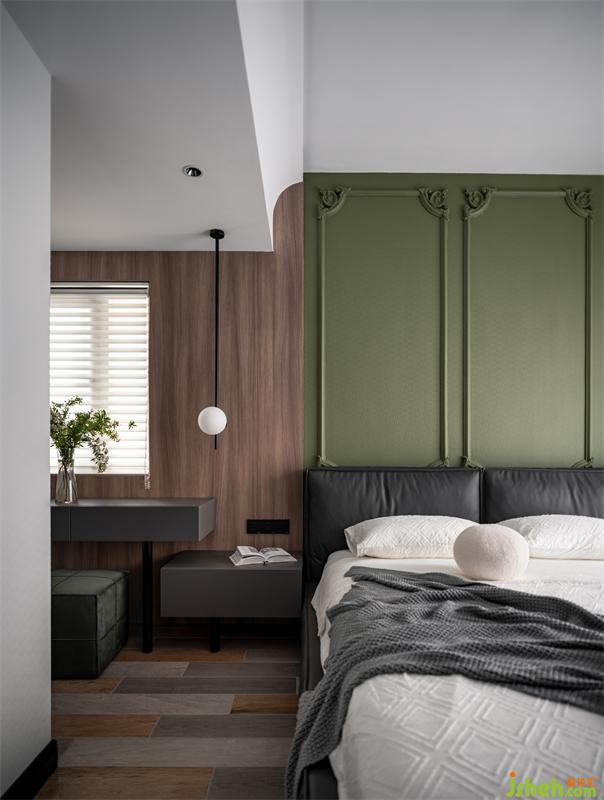 睡眠區(qū)域的壁布涂刷成草木綠,為滿是黑白灰的空間帶來生機與活力。2cm寬度的雕花線條,增添了柔和精致的氛圍感。
