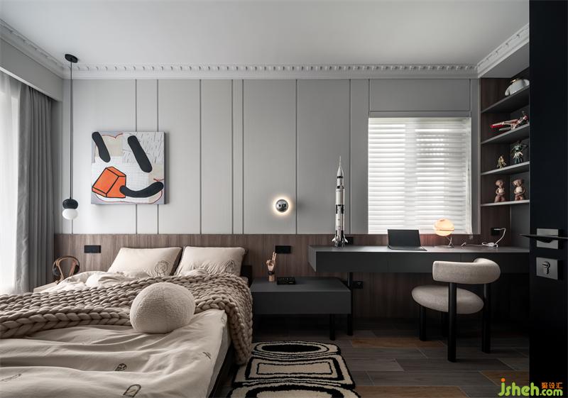 床頭背景墻設計了52cm高的木飾面,拼接灰色軟包材質,去掉厚重床頭,留出足夠空間自由活動。