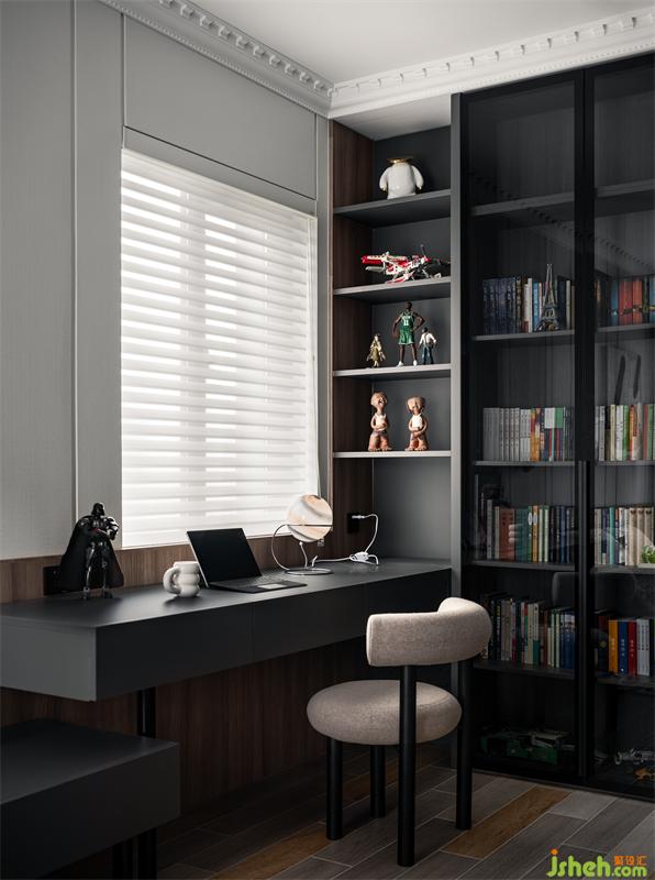 次臥室擁有雙面采光,臨窗擺放大書桌再合適不過。1.8m的超長書桌,堆滿試卷都沒問題。兩面1.6m的書柜,用灰色玻璃柜門搭配層板燈,查找書籍方便快捷。