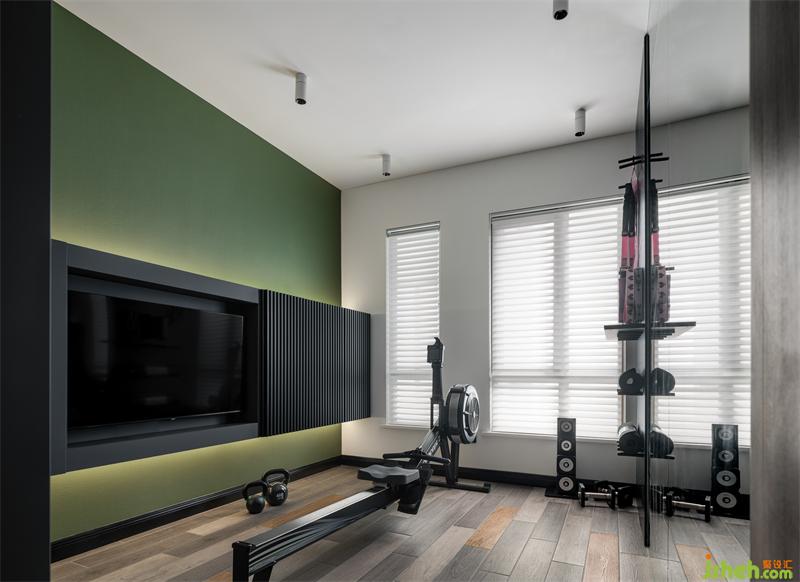 練功房內,一側是電視機、另一側是正面鏡子,可以對著視頻做瑜伽、鍛煉,并檢查姿勢是否正確。