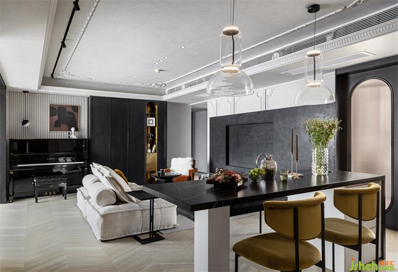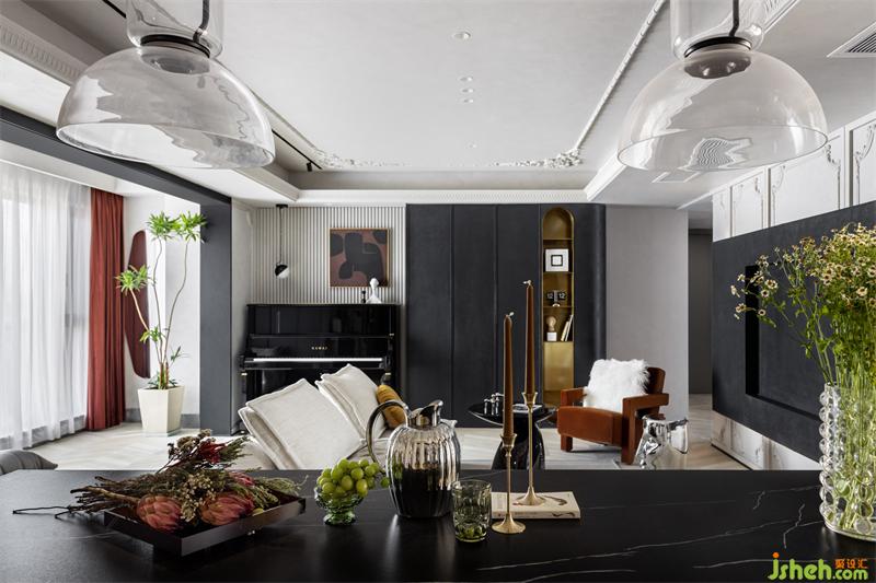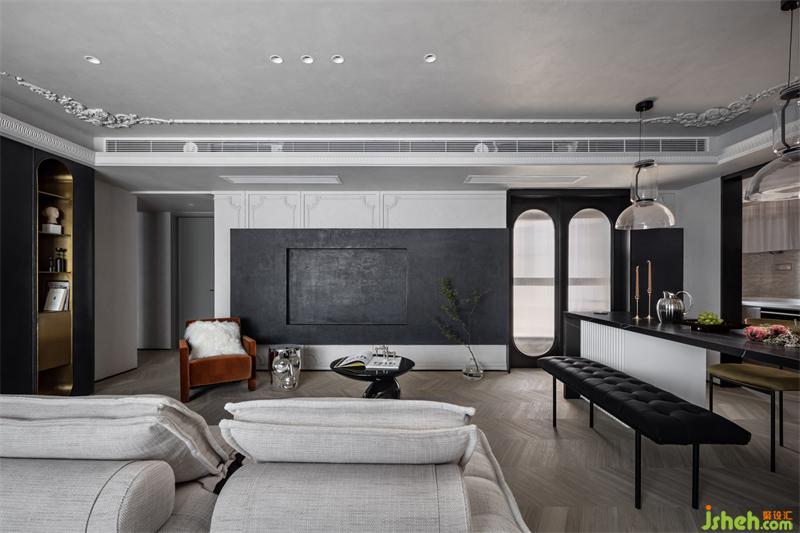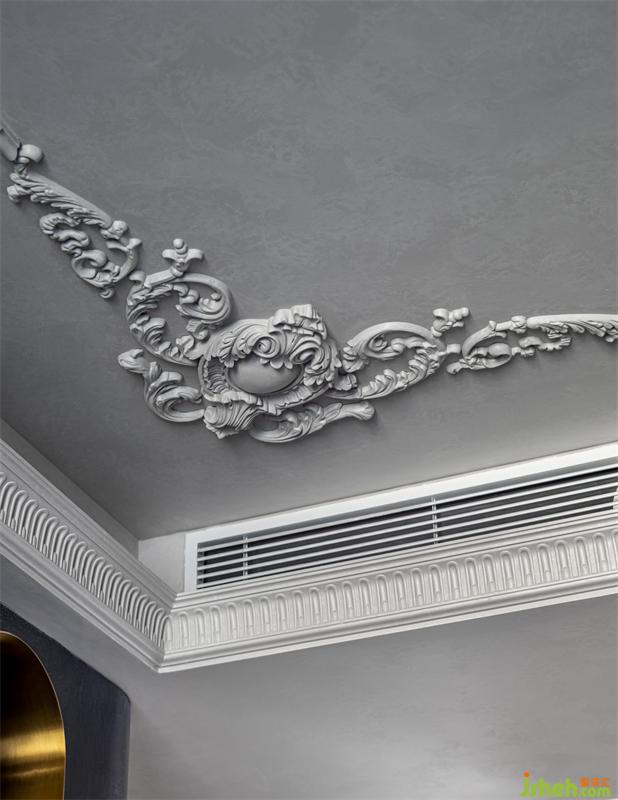 空間混搭的精髓在于硬裝保持簡(jiǎn)約,僅在細(xì)節(jié)上提煉法式韻味。比如恰到好處的PU角花,便是點(diǎn)睛之筆。去掉原有厚重吊頂后,僅點(diǎn)綴8cm左右的PU線條,并在四個(gè)角裝飾法式雕花,配上高級(jí)灰涂料,帶來(lái)精致的韻味。