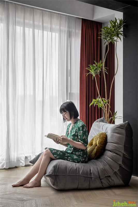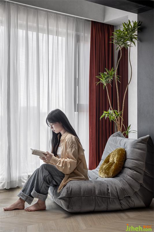 書(shū)柜大膽采用黑色,碰撞高級(jí)灰格柵板,多了視覺(jué)驚喜。局部開(kāi)放格采用金屬板,碰撞室內(nèi)紅色、橙色系軟裝,多了溫暖感。陽(yáng)臺(tái)設(shè)計(jì)了儲(chǔ)藏柜,超大的容量可以輕松收納各種雜物。角落放置藝術(shù)感穿衣鏡,女屋主可以在這里記錄OOTD。