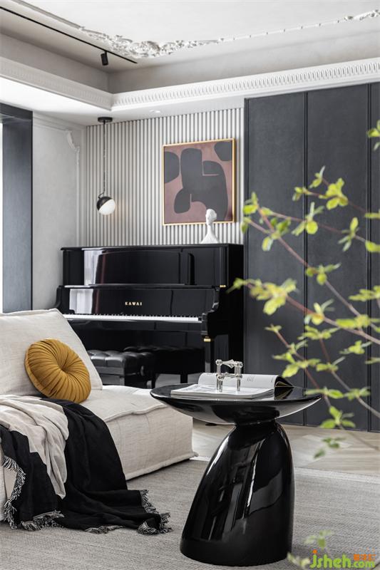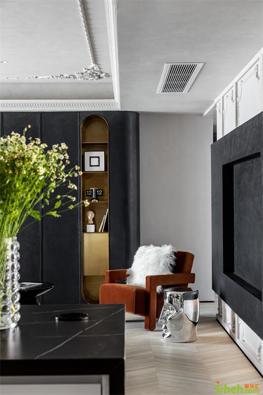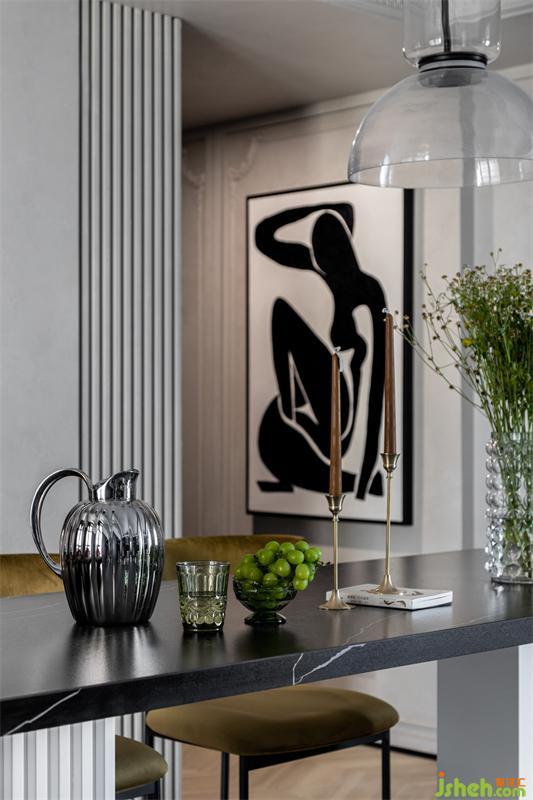客廳超大的巖板島臺(tái),選用黑白色系,與電視背景墻相互呼應(yīng)。85cm的高度,平時(shí)站著料理西點(diǎn)、插花,也很輕松。230cm*85cm的大島臺(tái),足以容納4-6人同時(shí)用餐。