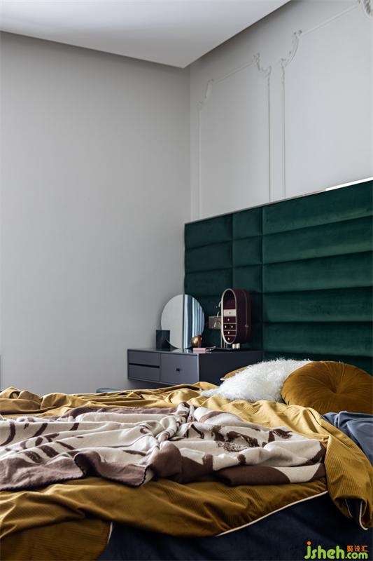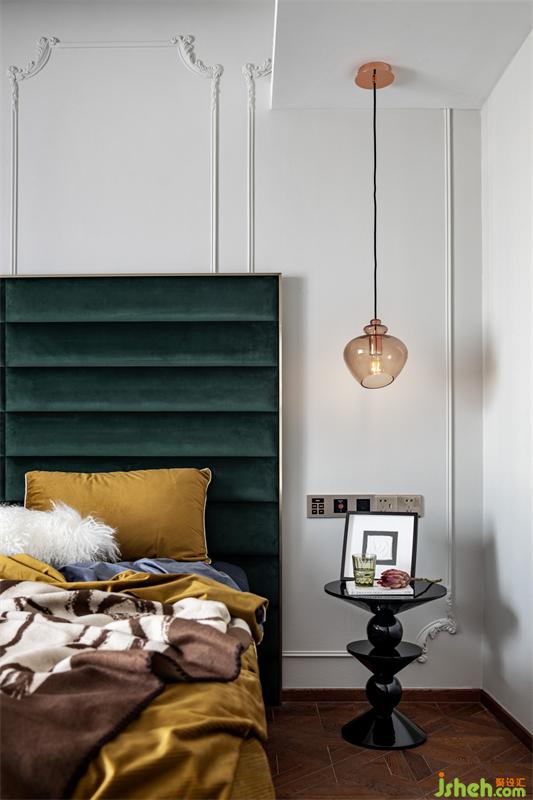 臥室是女屋主的自在小天地,290cm*160cm的綠絲絨床頭背景墻,復(fù)古風(fēng)十足,搭配鎢絲床頭吊燈,讓人瞬間放松。