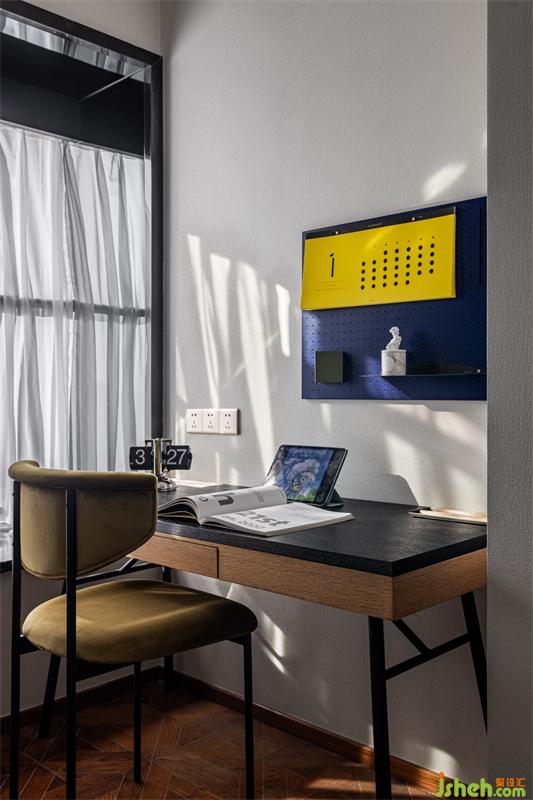 書房空間狹小,裝修設(shè)計按照常規(guī)擺放床鋪將毫無活動空間,考慮到長輩很少留宿,因此設(shè)計成男屋主專用的書房,搭配可折疊的沙發(fā)床,如果有客人留宿,也十分方便。