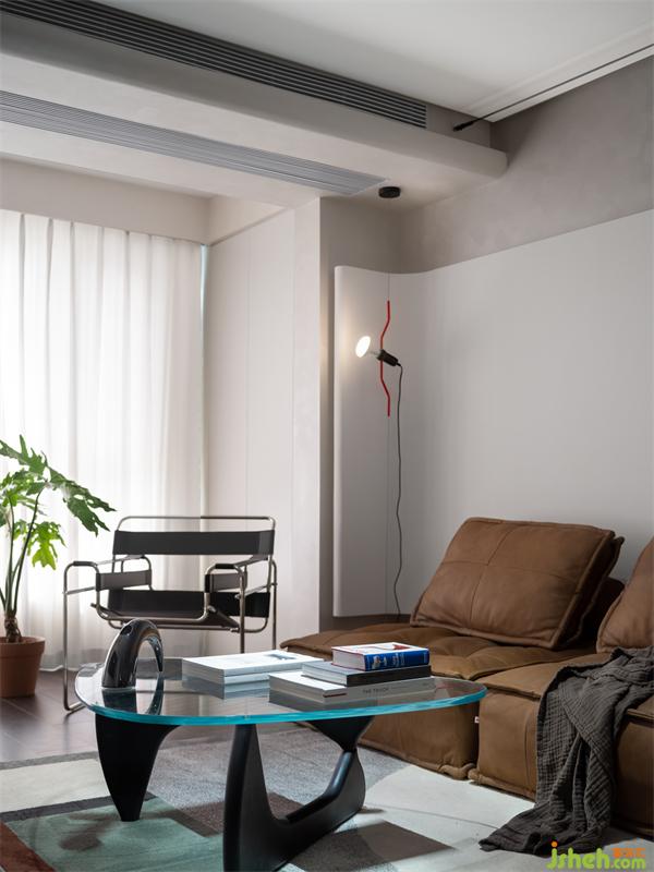 陽(yáng)臺(tái)納入客廳,經(jīng)由半透未透的紗簾過濾后的自然光落入室內(nèi),光影明暗的變化,為客廳帶來(lái)十足的韻律感。正如安藤忠雄所言:“自然光被恰當(dāng)?shù)囊脒M(jìn)來(lái),平凡的物質(zhì)也就有了生命力。”