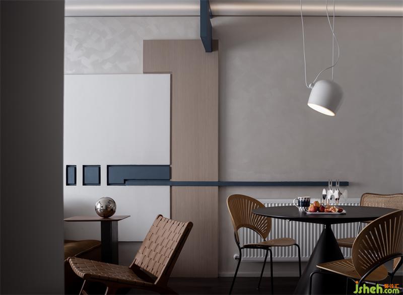 餐廳背景墻與客廳,借墻面穿插的線條創(chuàng)建聯(lián)系。體塊形狀和線條色調(diào)的變化,豐富墻面視覺內(nèi)容。圓形餐桌搭配線條流暢的貝殼餐椅,調(diào)和直線的冷硬,為用餐空間注入滿滿療愈力。