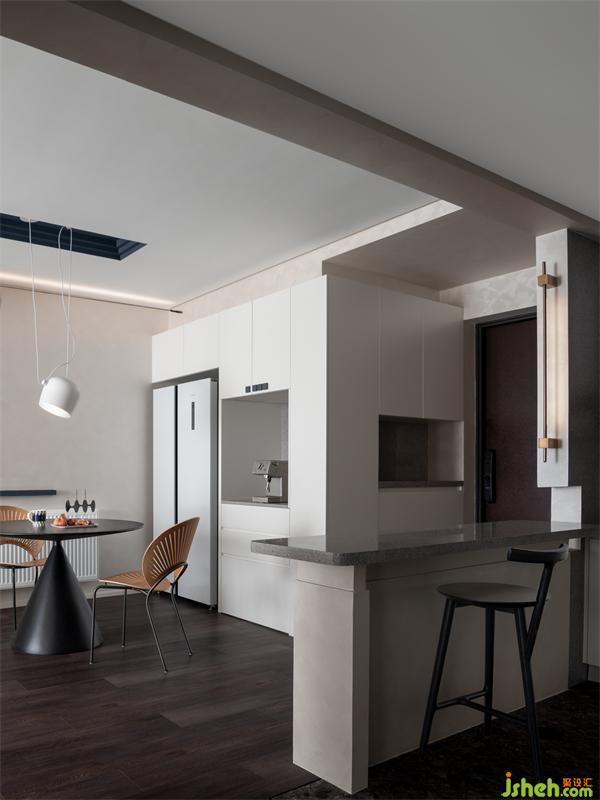 廚房墻面局部拆除,以開放形態(tài)展開。以玄關(guān)為開端設(shè)計(jì)出吧臺(tái),餐后在吧臺(tái)處小酌閑飲,將屋主向往的閑適生活進(jìn)行具象化表達(dá)。