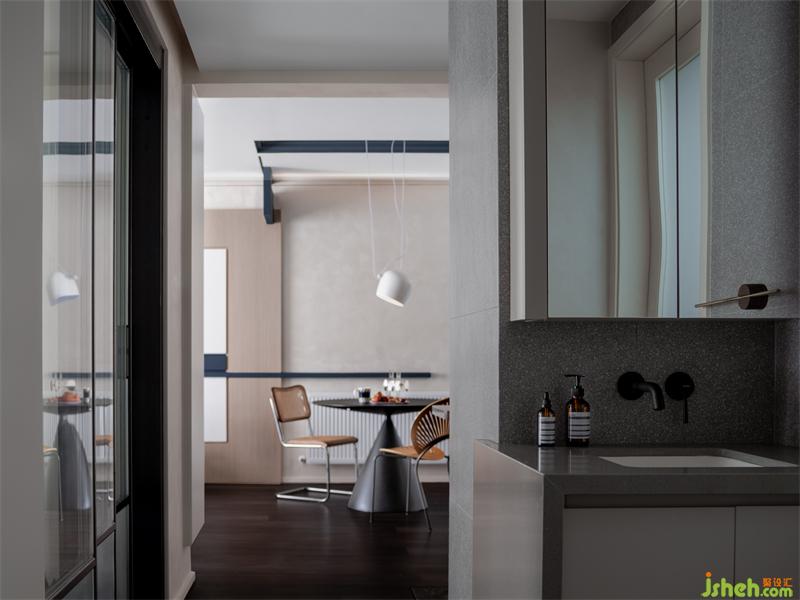 衛(wèi)生間干區(qū)分離出來(lái),弱化了狹長(zhǎng)過道視覺上的單一。干濕分離的設(shè)計(jì),讓洗漱沐浴更加便捷從容。