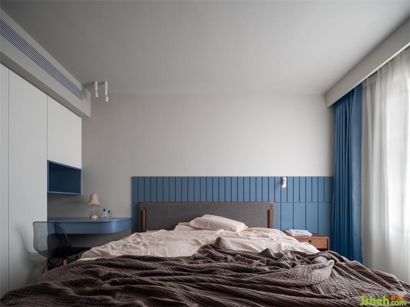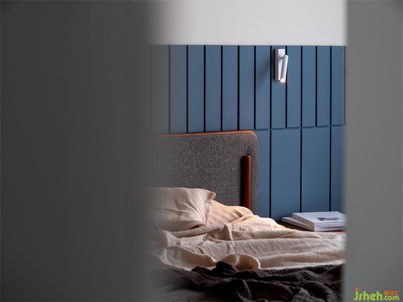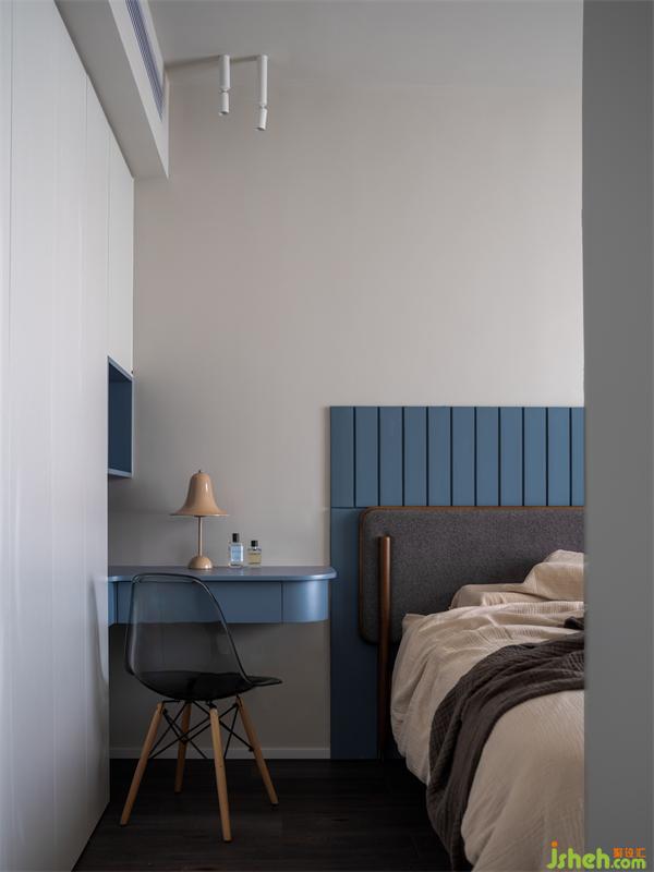 詩(shī)享家設(shè)計(jì)改變主臥開門位置,由書房到臥室更加便捷。臥室背景墻揉入靜謐藍(lán)色,色調(diào)的變化讓臥室氛圍更加柔和。