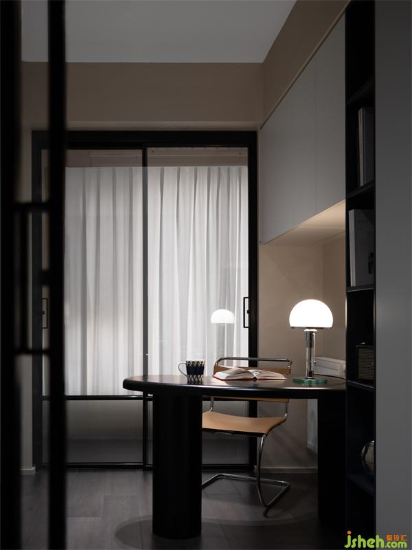 書房?jī)啥司O(shè)玻璃移門,陽(yáng)臺(tái)、書房、客廳形成環(huán)形動(dòng)線,書房成為公共活動(dòng)區(qū)與私密睡眠區(qū)的過渡空間。