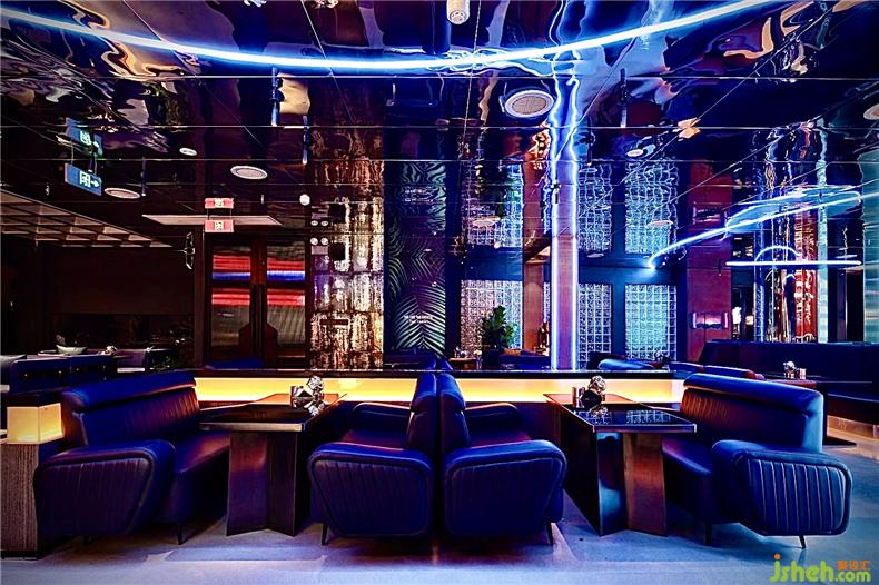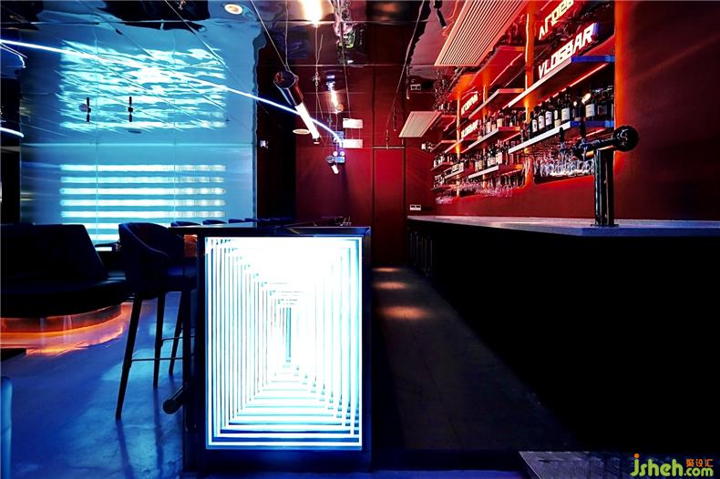 大面積得條紋藝術(shù)玻璃和藝術(shù)玻璃磚得應(yīng)用增加過渡空間立面立體感,酒吧設(shè)計(jì)藏于藝術(shù)玻璃后得
