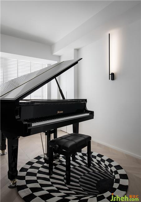 The geometric elements of carpet and the arrangement of black and white keys.The linear lights on the wall emit a soft light, and the air and the sound of the piano are integrated into one, accompanied by the starlight around the fingers, so that the baby practicing piano will be intoxicated by it.