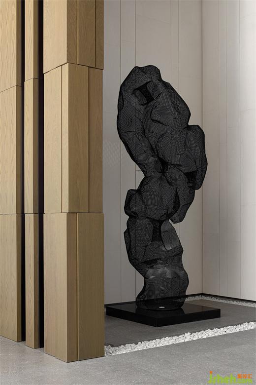 詩(shī)意空間設(shè)計(jì)立足中國(guó)傳統(tǒng),倡導(dǎo)「詩(shī)性東方」獨(dú)特語(yǔ)境下的設(shè)計(jì)表達(dá),淡雅的米黃石材與溫潤(rùn)的木紋貫穿整個(gè)空間,開(kāi)門(mén)見(jiàn)山,柏悅公館會(huì)所設(shè)計(jì)黑色金屬太湖石藝術(shù)裝置隱在幾何體塊肌理錯(cuò)落的格柵之后,若隱若現(xiàn),疏處不虛。