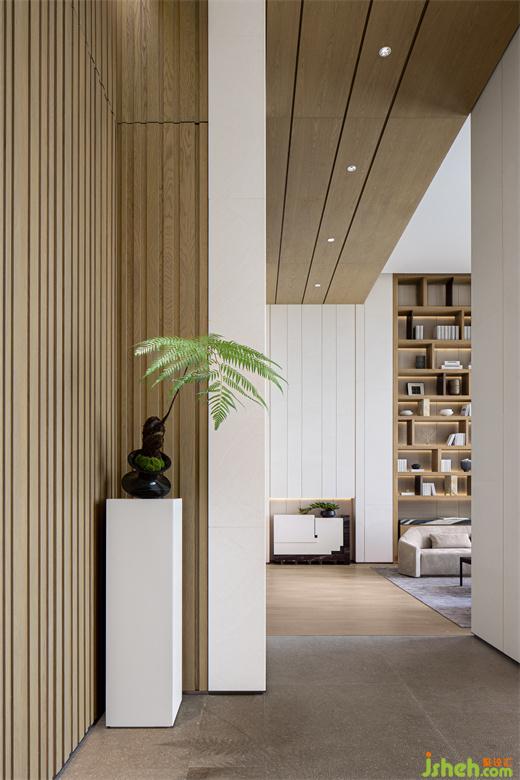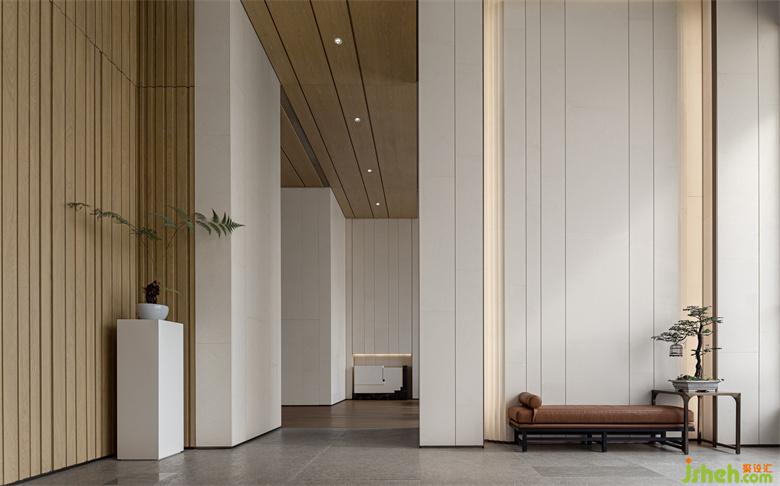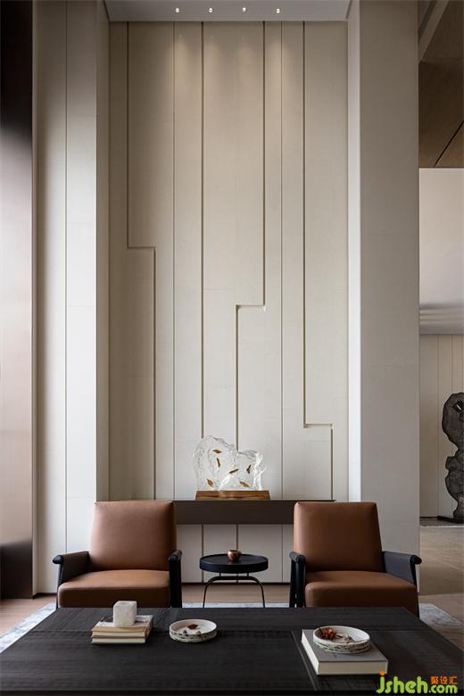 會客空間設(shè)色明凈,墻立面包裹的白色石材借助山水韻律的抽象線條縱向鋪排,柏悅公館會所設(shè)計與深色木紋家具、現(xiàn)代皮革座椅及陳設(shè)的干花、器物共同詮釋著格調(diào)清雅的生活美學(xué)范本。