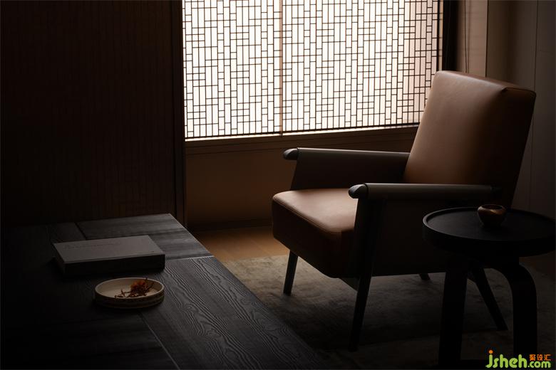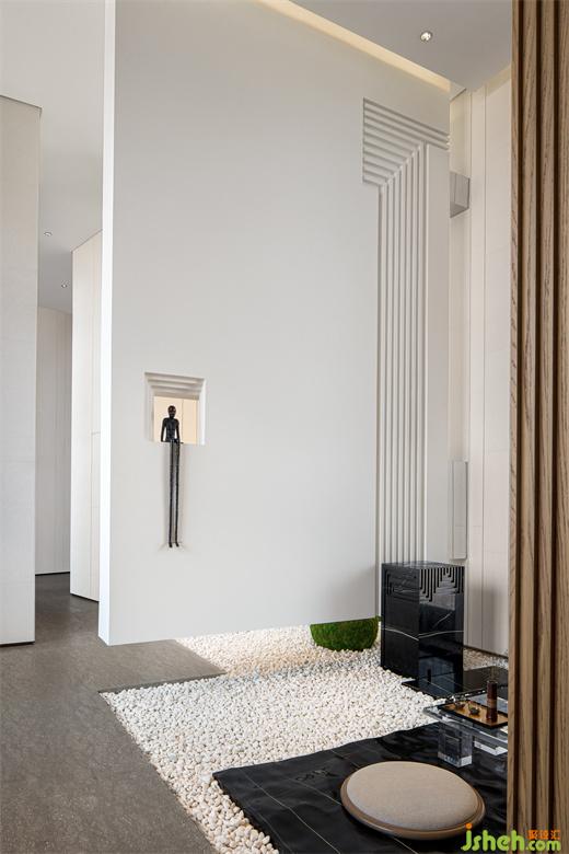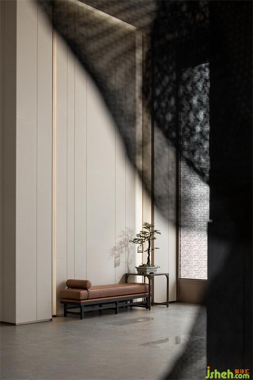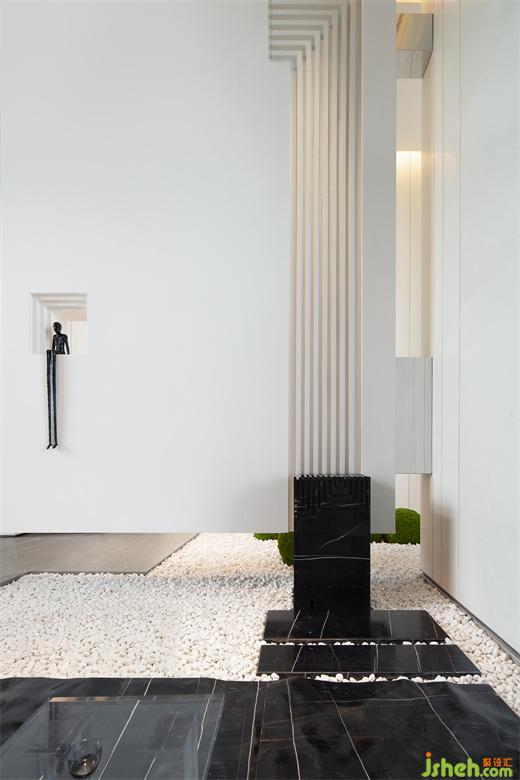 處處鄰虛,方方側(cè)景,旁側(cè)開鑿的一面方形漏窗延續(xù)空間中的幾何線條力量,從廊道另一側(cè)看過來,柏悅公館會所設(shè)計以洞開的窗口構(gòu)圖空間,端臺上相對而坐的雕塑藝術(shù)品顧盼之間彼此呼應(yīng),緘默萌趣。