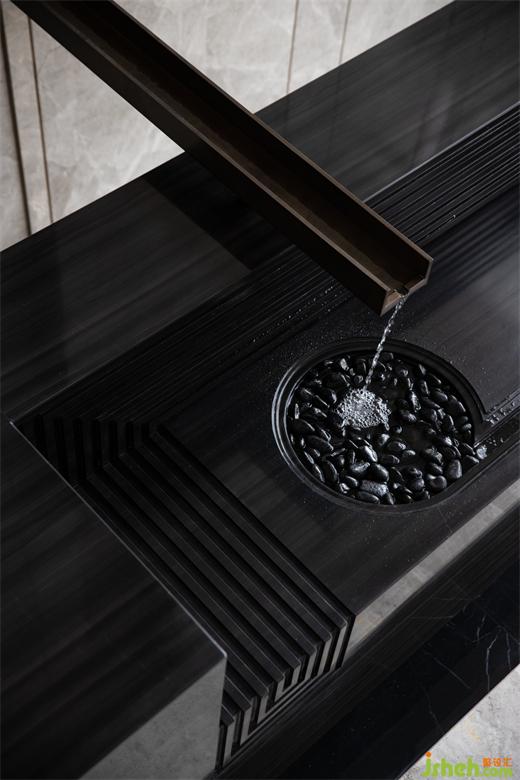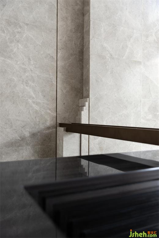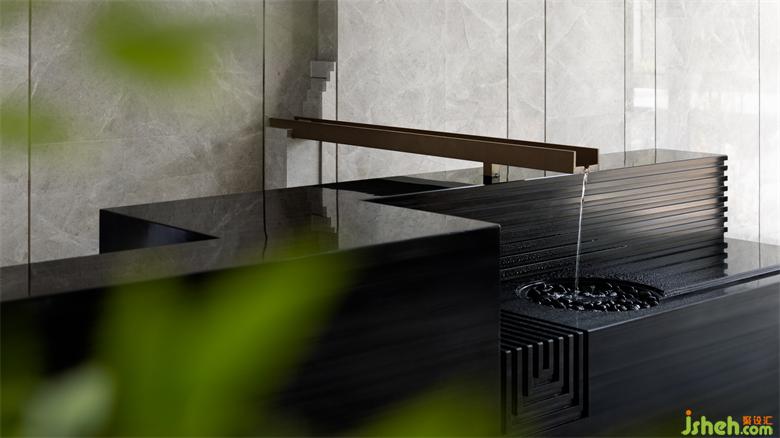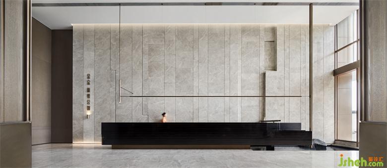步行穿越室外嶺南園林意境的山重水復(fù),接待區(qū)筆直的幾何線條與淡雅的灰色木紋石材交織出一派寧靜深遠(yuǎn)。借助豎向且有韻律的線條將立面灰色木紋石材縱向鋪排,包裹黑色木紋石材的長條接待臺延伸著空間尺度。