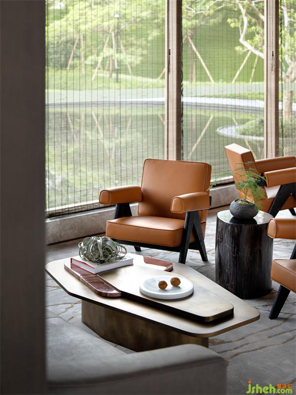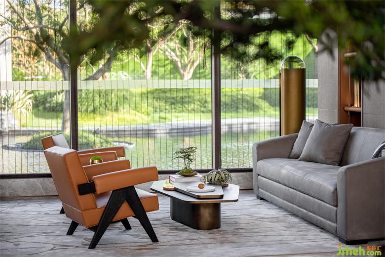 落地窗戶收納著園林水景的影影綽綽,小小方寸圍合出一個(gè)安靜的空間,坐在這里看書、喝茶或是賞玩,跟隨自己的節(jié)奏感受窗外的四季流轉(zhuǎn)。