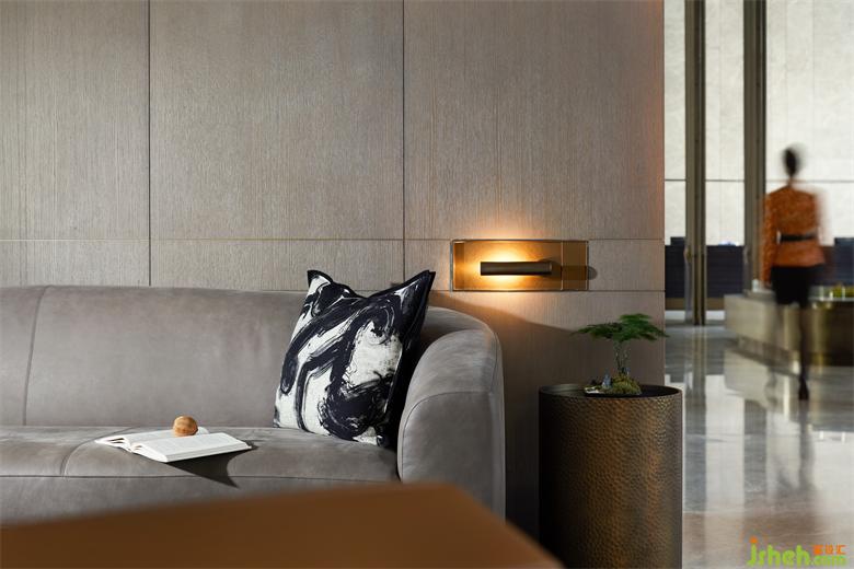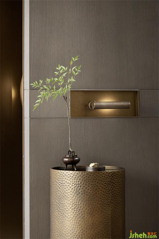 落落高大的溫潤(rùn)淺灰色木紋,點(diǎn)綴古銅金屬藝術(shù)燈具,水墨靠枕喚醒了赭石色與灰色皮革沙發(fā)的溫雅。同色系手工錘紋金屬圓形邊幾,襯一棵單株南天竺,安靜而純粹,靜靜感知當(dāng)下的勃勃生機(jī)。