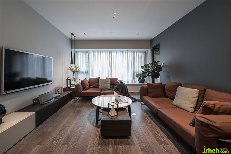 深色背景墻和咖色沙發(fā)的質(zhì)感對(duì)比(開(kāi)燈效果)