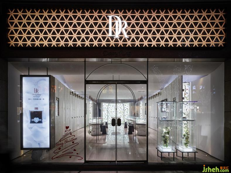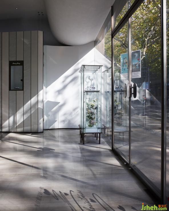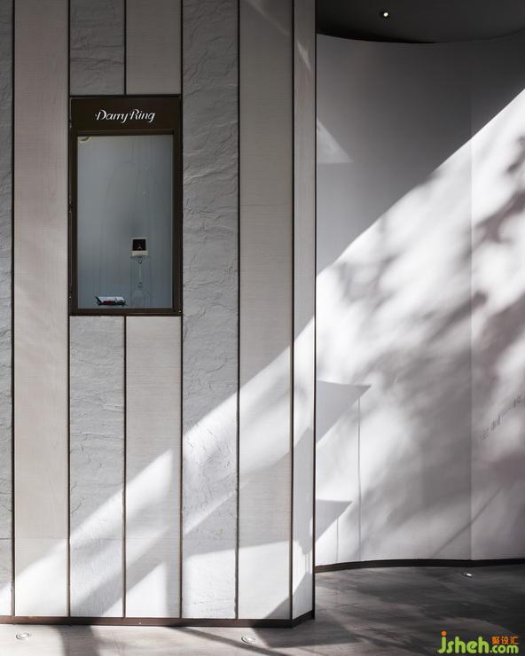 The boutique is covered with soft tincture, and designers select different kinds of white wood grain, paint and slate for associating with pure, lovely and elegant impression on white. In addition to light color, interior details are decorated with dazzling gold to symbolize sumptuous diamond rings. The imitated white rocks under showcases were made by Fiber-reinforced plastic, and reveal as firm as each love. Furthermore, this space is vibrant with waved ceiling, horizontal and vertical veneers and irregular slates on wall surface.