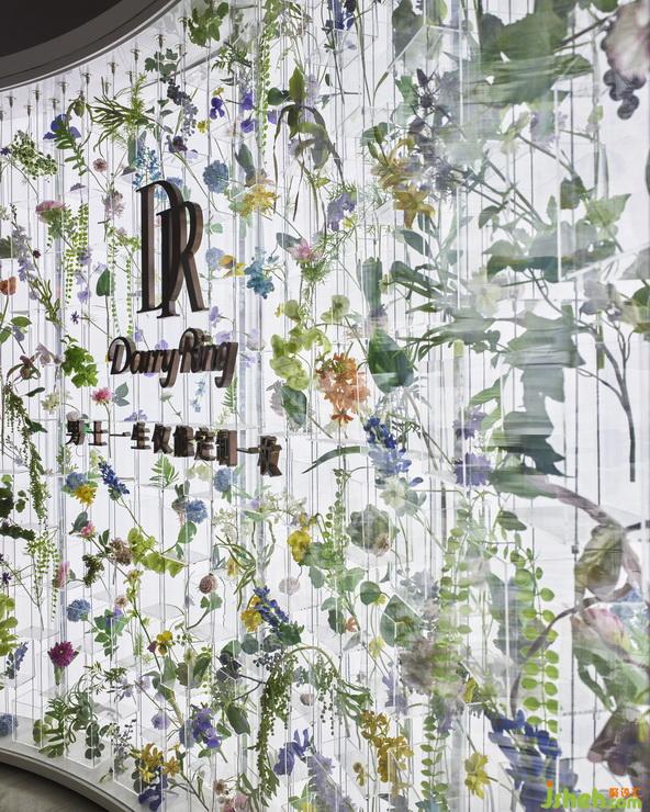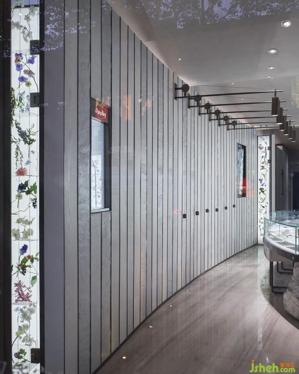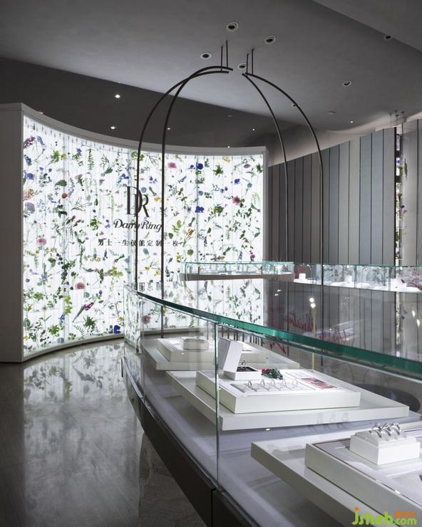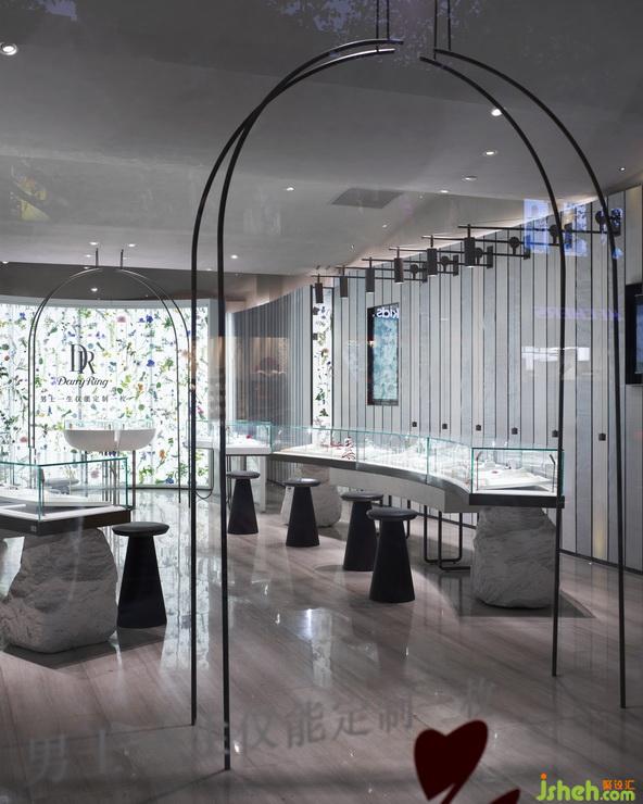 Referring floor plan to Basilica churches from Rome, designers replace corridor columns by two rows of unique lights and glass showcases. The symmetrical layout is ended up with an arc wall which is full of vivid flowers and its form is imitated from Apse of Basilica. Blossom wall takes the place of archaic murals and stained glass, and creates an altar with a round shape display cabinet. We refer western classical aesthetics such as circular arch and symmetry to rebuild a love temple which is balanced in couples.
